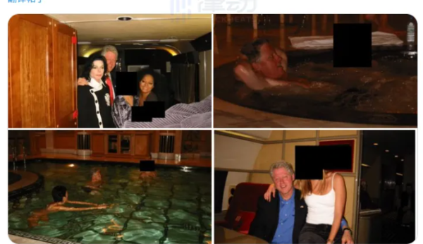 在一张照片中,克林顿与一名身份不明的女子在浴缸里。另一张照片中,可以看到克林顿与迈克尔·杰克逊在一起。
