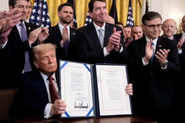 2025年7月18日(周五),美国总统唐纳德·特朗普在华盛顿白宫东厅举行的签署仪式上展示刚刚签署完成的《GENIUS法案》。