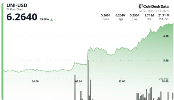 根据Uniswap治理数据,UNI于12月20日03:50 UTC投票期开始后不久开始上涨。TradingView的一天UNI-USD图表显示,涨势最猛烈的阶段出现在投票窗口的早期时段,价格突破了5.40至5.50美元区间,并在当天持续上涨,交易量也同步上升。