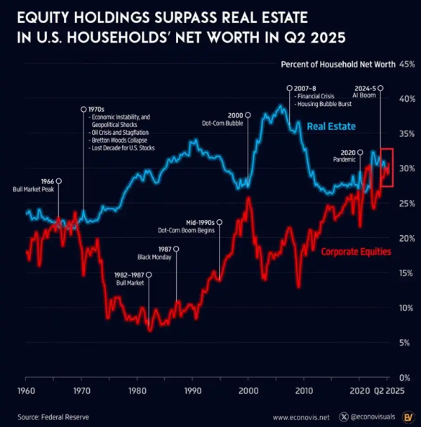 (正规的炒币平台有哪些)12月22日,KobeissiLetter发布数据,美国股市本轮涨势堪称历史性,美国家庭目前股票占净资产的比例超过了房地产,为过去65年来第三次出现这种情况。与此同时,企业股票和共同基金在2025年第二季度占净资产的比例上升至约31%,创历史新高。自2008年以来,这一比例已经翻了一番多。相比之下2000年互联网泡沫时期的峰值约为25%。(正规的炒币平台有哪些)