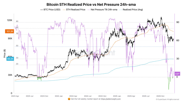 分析师指出,市场显示短期持仓者的买卖压力处于平衡状态。历史上,这种平衡期并不稳定,在牛市中往往会转向上涨,随后再次转为抛售压力。然而,当前的情况较为复杂,价格已连续近两个月低于STH实际价格13.9%,短期持仓者蒙受损失,市场已进入熊市阶段。如果价格跌破85,000美元,且净压力低于-15,则表明回调幅度将进一步加大(炒币平台哪个是正宗的)