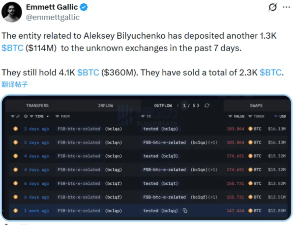 12月24日,据Arkham分析师Emmett Gallic监测,被美国司法部指控为门头沟黑客的Aleksey Bilyuchenko,其相关的实体在过去7天内向未知交易平台存入了1300枚BTC(价值约合1.14亿美元)。该系列地址仍持有4100枚BTC(价值3.6亿美元)。他们总共已售出2300枚BTC。(正规炒币app)