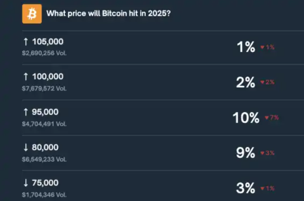 12月25日,(虚拟币的几个平台)Polymarket上预测「比特币12月跌破8万美元」概率暂报9%,预测跌破7.5万美元概率暂报3%。此外,预测突破9.5万美元概率暂报10%。(虚拟币的几个平台)