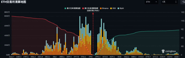 12月26日,据Coinglass数据,若以太坊跌破2900美元,主流CEX累计多单清算强度将达8.02亿。