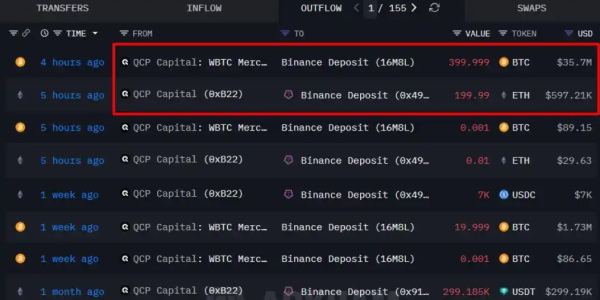 12月26日,(炒币的软件)据Onchain Lens监测,QCP Capital 5小时前向Binance存入400枚比特币和200枚ETH。(炒币的软件)