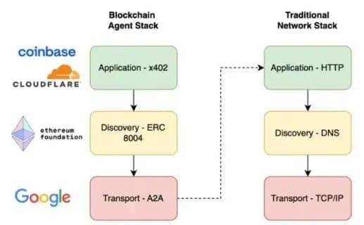 如今,我们正看到去中心化人工智能(deAI)的“网络协议栈”在逐步构建起来。正如互联网运行在一系列可互操作的标准之上——传输层采用 TCP/IP,服务发现层采用 DNS,应用逻辑采用 HTTP——我们也可以将 deAI 协议栈分解为这三个模块:应用层采用 x402,服务发现层采用 ERC 8004,传输层采用 A2A——所有这些都运行在传统的 HTTP 网络协议栈之上。