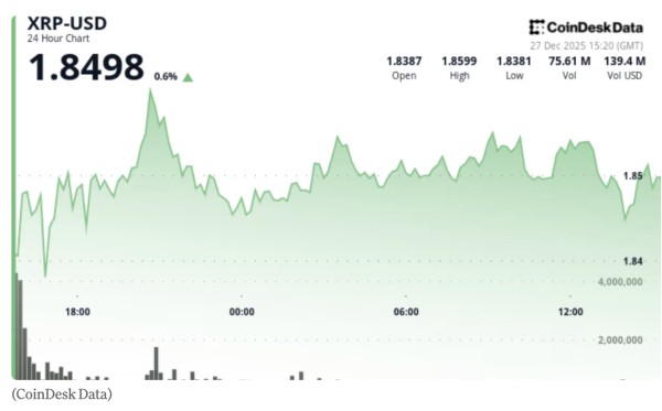 XRP 从 $1.8783 下滑至 $1.8604,依旧锁定在 $1.85–$1.91 区间内