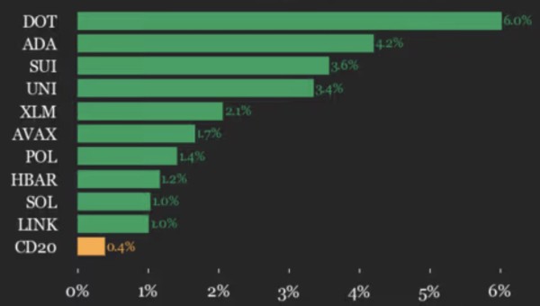 领涨者:DOT(+6.0%)和 ADA(+4.2%)。