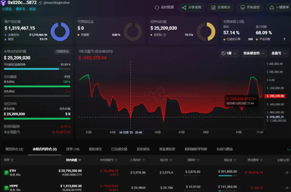 12月29日(什么平台可以买币子)(什么平台可以买币子)据HyperInsight监测,「麻吉」于市场下跌期间持续加仓ETH和HYPE多单,但由于市场急跌,其整体多单再度转入浮亏。截止发稿,其总持仓价值升至2520万美元:
