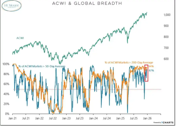 12月31日(在哪儿可以买币),据The Kobeissi Letter分析,MSCI全世界国家指数(ACWI)涵盖的市场中,约94%现在运行在其200日移动平均线之上,接近5年来的最高水平。与此同时,约87%的ACWI国家市场位于其50日移动平均线之上,这是自今年7月以来的最高水平。(在哪儿可以买币)