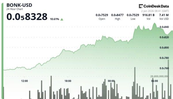 BONK 价格上涨约 10.6%,交易价格接近 0.00000833 美元,延续短期反弹势头。