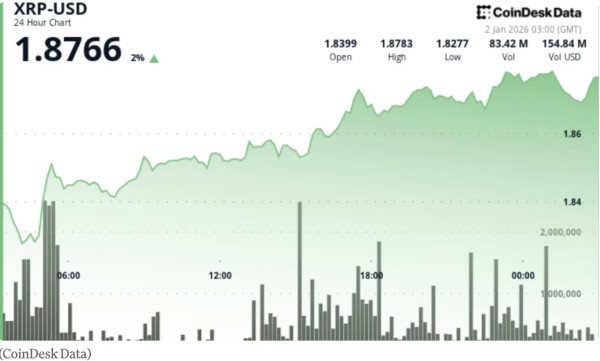 XRP 价格大约上涨了 1.7%,从 1.84 美元升至 1.87 美元,全天呈现更高的低点,且维持在相对有限的 0.05 美元区间内(约 2.5% 的日内波动)。参与度在关键时刻有所提升:成交量在上涨过程中扩大(约为 3200 万,约比平均水平高出 50%)——这表明此次上涨并非仅凭薄弱的流动性漂浮上行。
