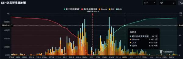 1 月 3 日,据 Coinglass 数据,若以太坊突破 3200 美元,主流 CEX 累计空单清算强度将达 9.07 亿。