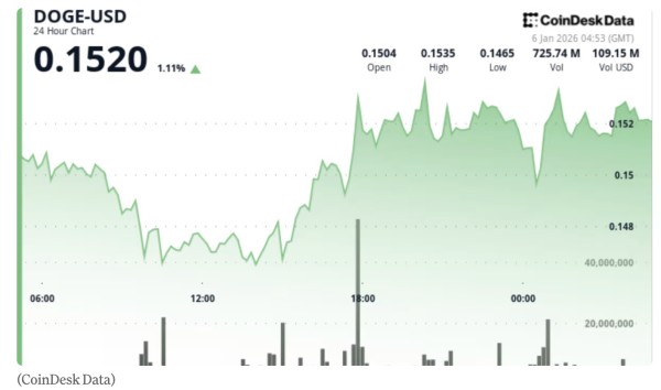 DOGE 当日基本持平($0.1518至$0.1519),但重点在于其走势结构:在急剧下挫至$0.1461(1月5日09:00)后,呈现出 V 型反弹,并在美股下午时段强劲回升。