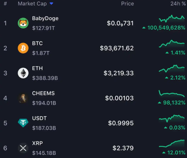 同时出现 BUG 的还有 Meme 币 CHEEMS,该币种价格被 BUG 影响改为 0.00103 美元(实际为 0.00000103 美元),市值改为 1940 亿美元,超越 USDT 和 XRP,一度位列加密市场第 4 名,24 小时涨幅错误录为 98.132%。(币交易所排名前10名)