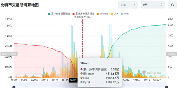 1 月 7 日,据 Coinglass 数据,若比特币跌破 9.1 万美元,主流 CEX 累计多单清算强度将达 5.08 亿。