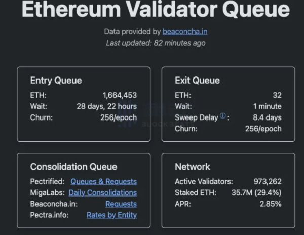 1 月 8 日(怎么买稳定币),据验证者队列追踪网站 validatorqueue 数据,当前排队等待加入网络的 ETH 升至 1.664.453 枚,价值约合 52 亿美元,预计激活延迟约为 28 天 22 小时。主要原因为 BitMine 近期将其持有的大量 ETH 质押。(怎么买稳定币)