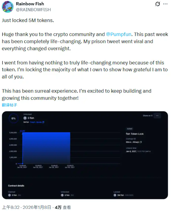 该币灵感来源于国际畅销书《The Rainbow Fish》中的角色。其本次热度起源于 X 平台知名戏仿账号 Rainbow Fish——该账号在沉寂四年后,于 1 月 1 日下午突然回归并互动玩梗。随之在 Pump fun 上出现同名代币,带动 FISH 及相关 Meme 币在 Solana 上炒作,市值曾在一天内从约 7 万美元急速拉升至 70 万美元,增长近十倍。(什么平台买币可以随买随卖)