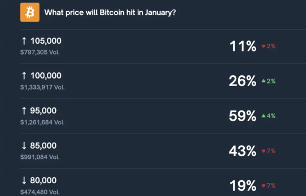 1 月 9 日,(那个平台可以买币、)Polymarket 上预测「比特币 1 月涨至 10 万美元」概率暂报 26%。此外,预测其涨至 9.5 万美元概率暂报 59%,跌至 8.5 万美元暂报 43%,跌至 8 万美元暂报 19%。(那个平台可以买币、)
