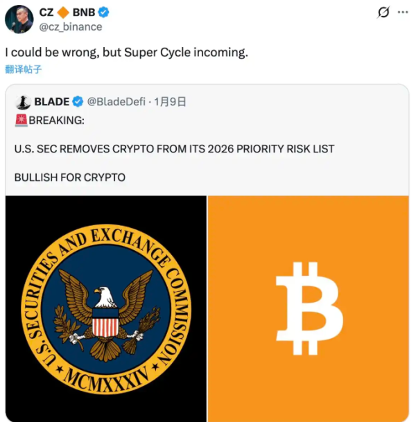 1 月 10 日(虚拟币哪个好),Binance 创始人 CZ 转发一则推文(美国证监会已将「加密资产」从其 2026 年重点风险清单中移除,这对加密市场构成明显利好)称:「我也可能判断有误,但看起来「超级周期」即将到来。(虚拟币哪个好)