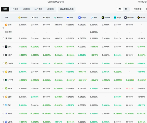1 月 10 日,据 Coinglass 数据显示,加密市场经历近期的波动后,目前主流 CEX、DEX 资金费率显示市场已不再看空 BTC 和 ETH,主流平台上资金费率均已回归中性,但山寨币仍然存在大规模负费率的情况,具体主流币种资金费率如附图所示。(交易平台哪个最安全)