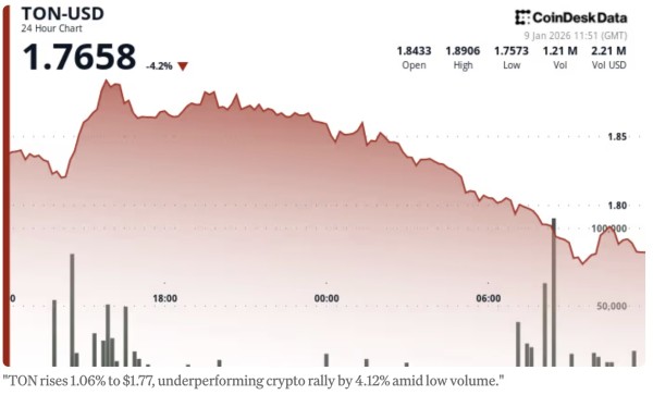 Toncoin(TON)在24小时内下跌超过4%,跌至1.76美元,因卖压超过了大盘的涨幅。