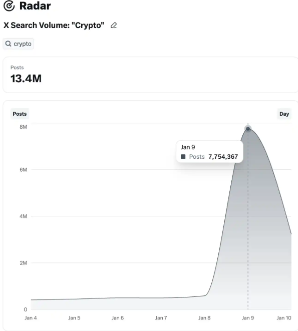 1 月 11 日(币圈十大交易所app),CryptoQuant 首席执行官 Ki Young Ju 在社交媒体发文表示,昨天 X 平台上的机器人发布了 7.754.367 条加密相关帖子,增长了 1.224%。这导致「加密货币」相关的帖子被 X 平台算法屏蔽。