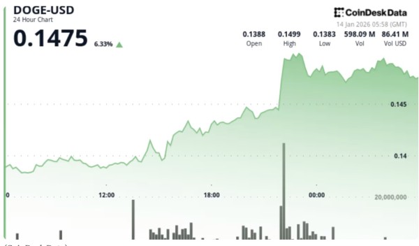 狗狗币上涨近9%,达到0.14美元,在成交量激增的情况下打破了持续数周的下跌趋势。