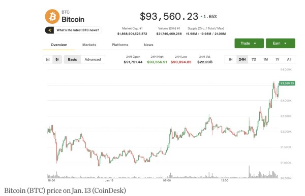 周二,比特币突破93,500美元大关,24小时内上涨超过2%,投资者对稳定的通胀数据、政治不稳定性以及作为宏观对冲工具的加密货币重新引起兴趣作出反应。