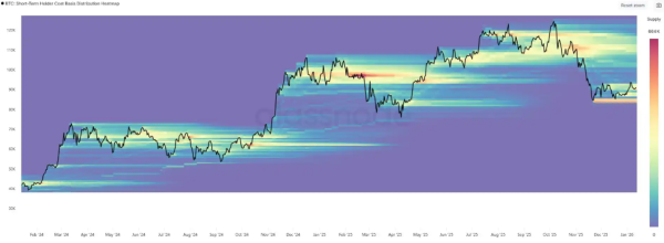 1 月 15 日(虚拟币的几个平台),glassnode 通过最新的比特币短期持有者成本基础分布(CBD)热图得出结论,比特币价格在 8 万至 9.5 万美元区间的盘整源于上方供应集中,对近期买家成本基础形成阻力。