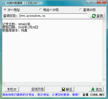 随数据库附送的查询程序(Showip.exe)具有在线检测并升级IP数据库的功能,只要运行该程序,点击右上角的“在线升级”,就可以升级IP数据库到最新的版本,无需再到下载网站下载新版的IP数据库。
